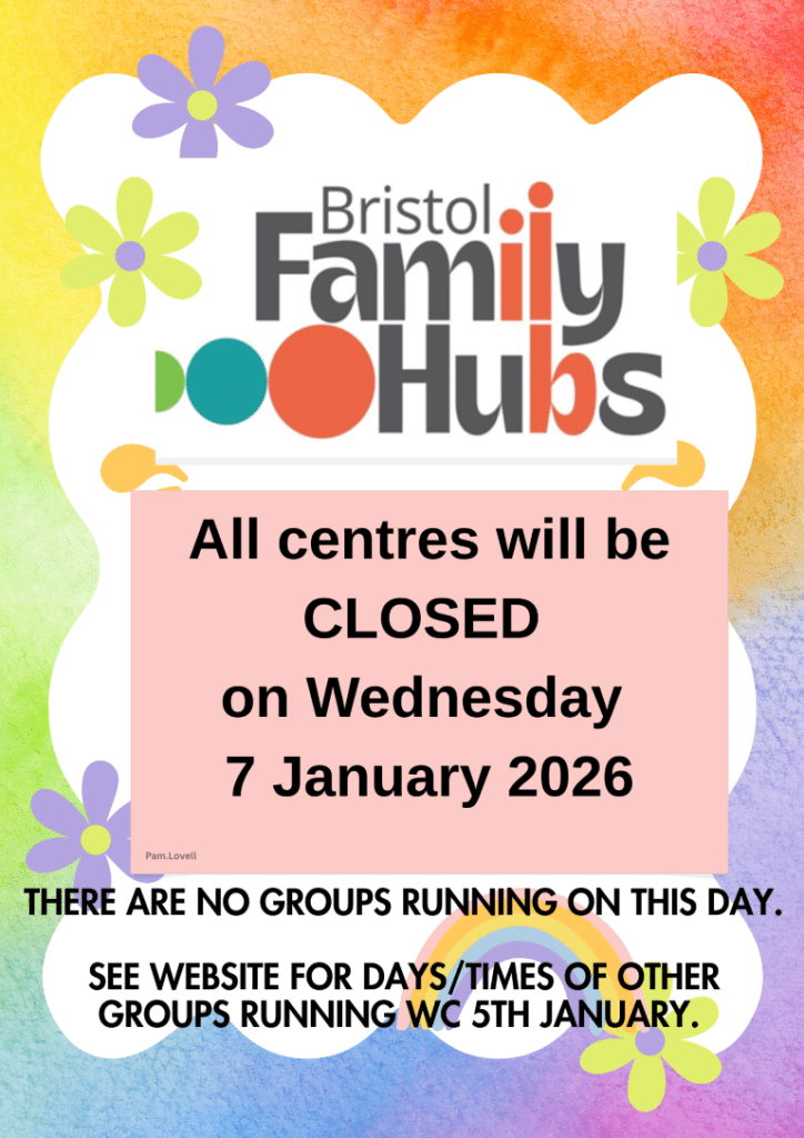 Please note that all Bristol Family Hubs centres will be closed on Wednesday 7th January 2026, with no groups running on this day. View our Timetable here.